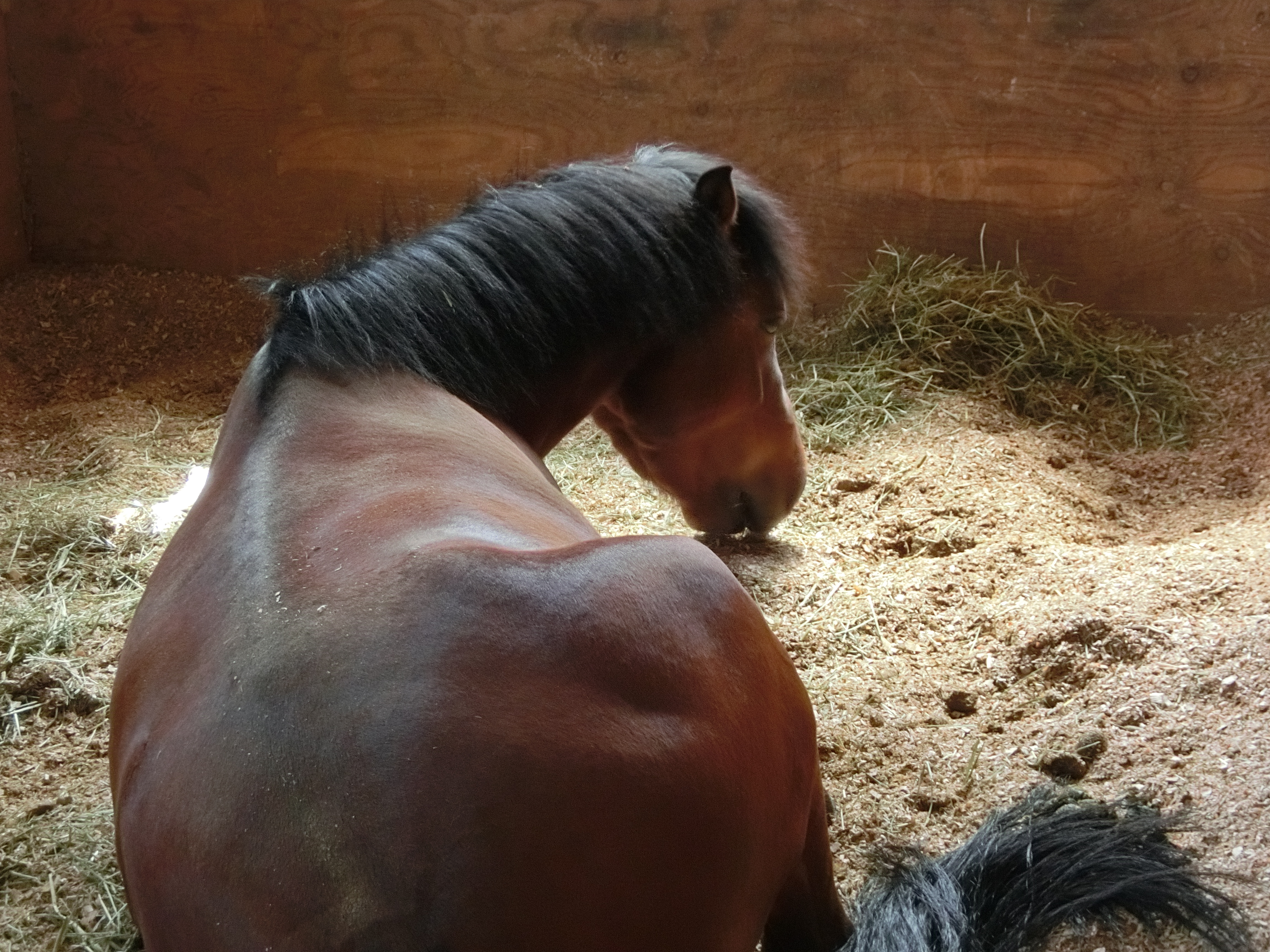 対州馬のふうまが、馬房の中で寝ころがっていました。 サラブレッドやドイツ系の馬でも寝ころがりますが ふうまは小型で身軽なせいか、はたまた本人(本馬)の気質のせいか 朝はたいてい寝ころがっています。